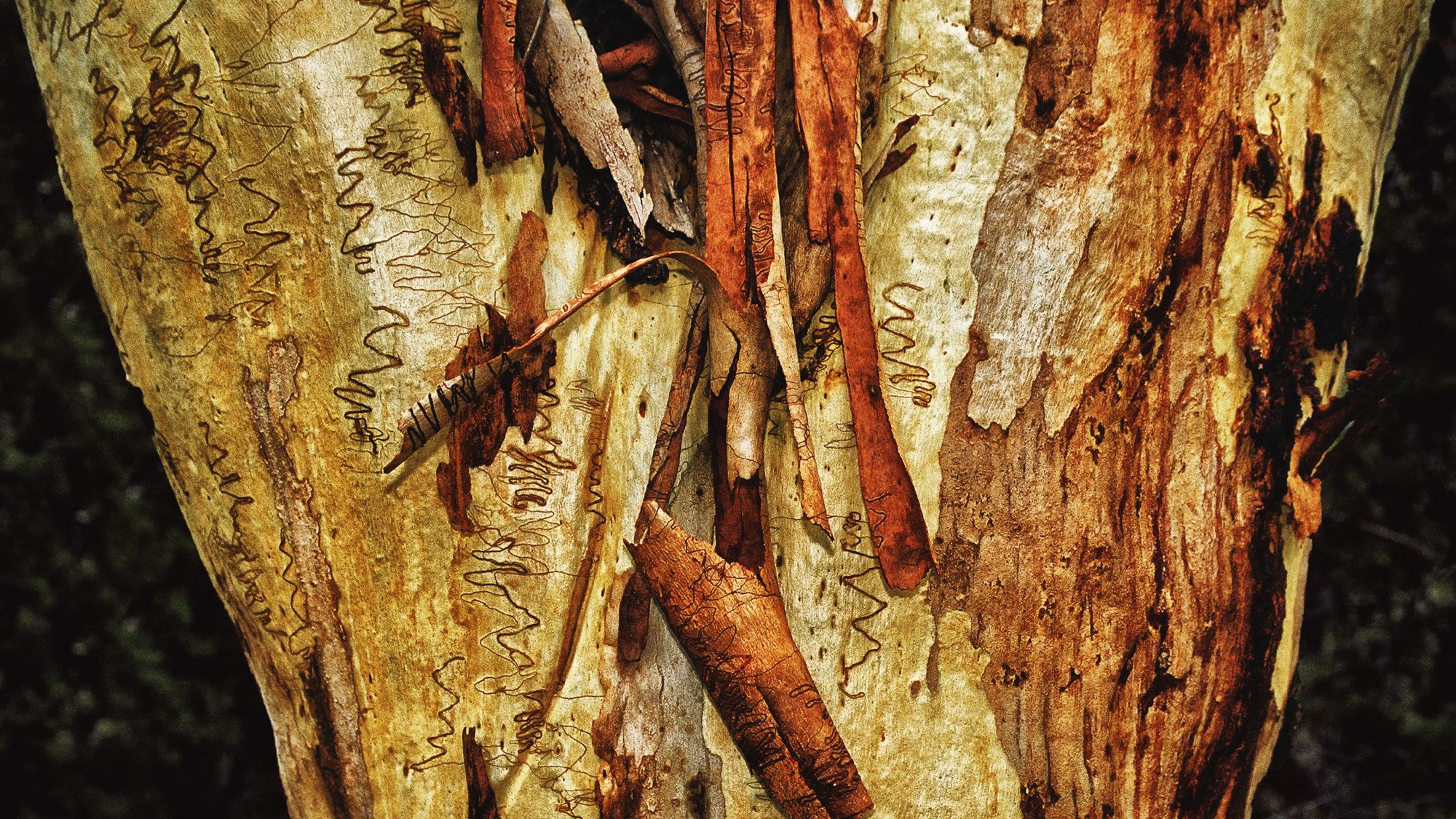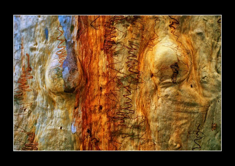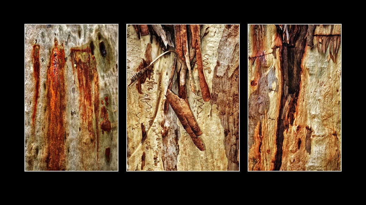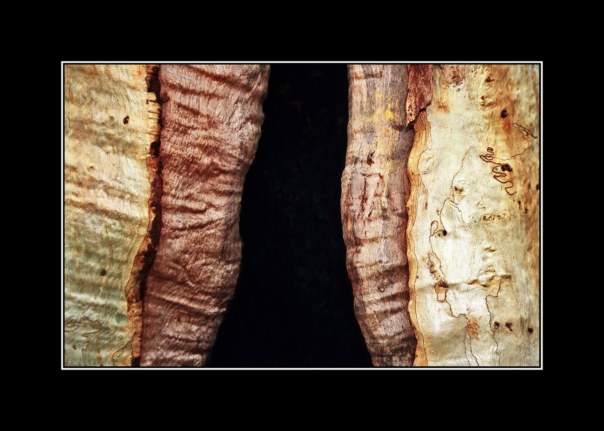 Trunks of eucalyptus trees on Fraser Island in Australia are graphically arranged.