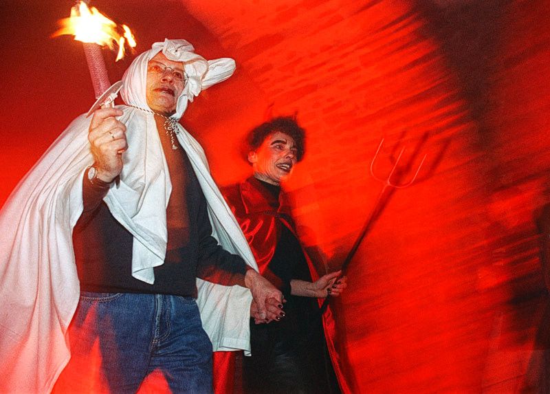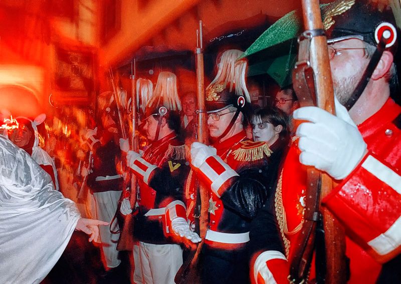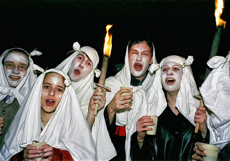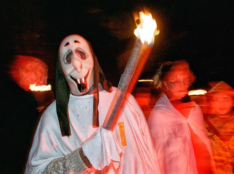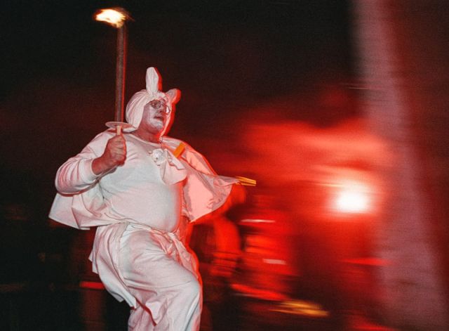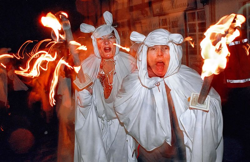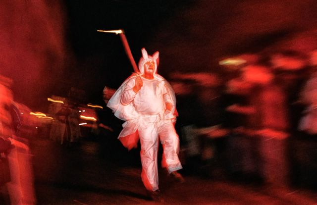 In weiße Laken gehüllte Geister springen mit Pechfackeln in der Hand und Juh-Jah rufend durch die verdunkelten Gassen um den Winter auszutreiben.